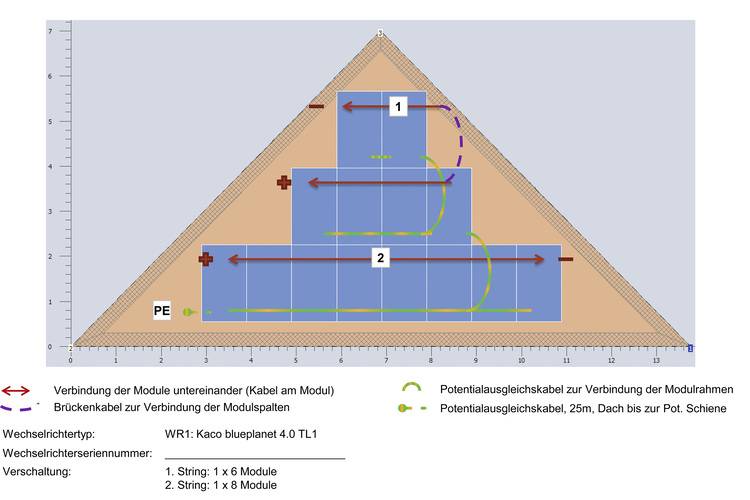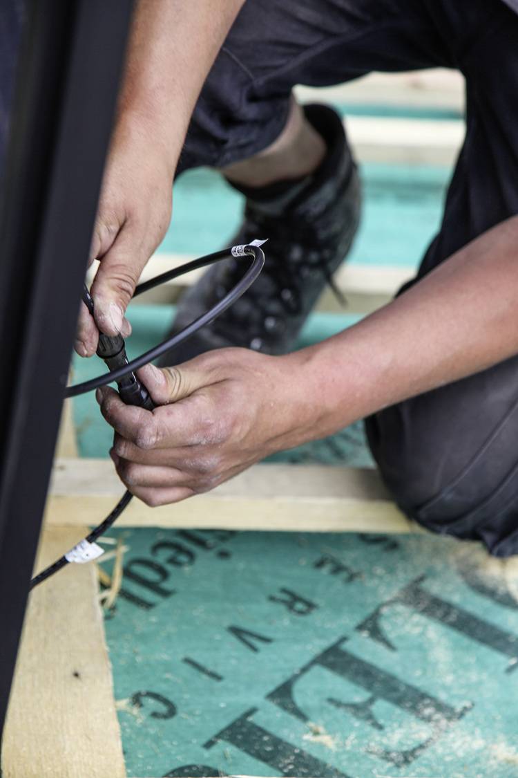 Die einzelnen Solarstrommodule werden mit den entsprechenden Eindeckrahmen zu beliebig gestaltbaren Feldern zusammengesetzt. Zur Verschaltung besitzen die Module zwei Solarkabel (eine Plus- und eine Minusleitung) mit Steckern, die verpolungssicher mit den Nachbarmodulen sowie der Anschlussleitung zum Wechselrichter verbunden werden.