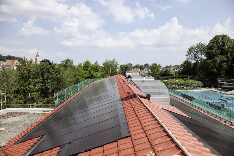 Die Anlage wurde, abgestimmt auf die Walmdachflächen, auf vier Generatorflächen verteilt. Hier zeigte sich die Flexibilität der dachintegrierten Solaranlage, die sowohl an die Walmdächer wie auch an die großen Lüftungsdurchgänge angepasst werden konnte. Mit dem modular aufgebauten Eindeckrahmen ist die sichere Einbindung in die umgebende Dachdeckung mit dem Dachziegel Rubin 9V möglich.