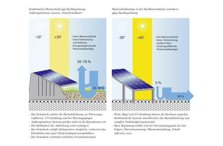 Dadurch wird ein langer, störungsfreier Betrieb der Solaranlage ermöglicht. Ebenso schützt der Gründachaufbau die empfindliche Dachabdichtung bei der notwendigen Wartung der Solaranlage. Zu beachten ist nur, dass die Photovoltaikmodule nicht durch Pflanzen verschattet werden. Gegebenenfalls müssen Kiesstreifen vor den Modulen eingesetzt werden.