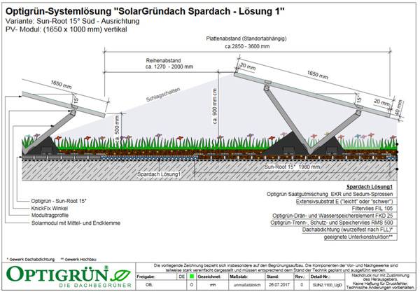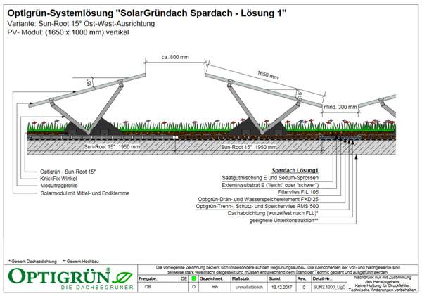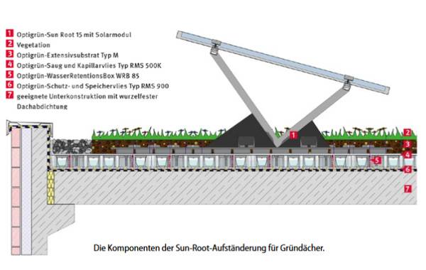 Bisher kamen die Montagesysteme für bewachsene Gründächer meist aus der Solarbranche. Das sogenannte Solargründach wurde von Dachexperten der Firma Optigrün International entwickelt. Optigrün hat seinen Hauptsitz in Göggingen südlich von Sigmaringen, eine Niederlassung befindet sich in Wien. Das Solargründach wird als auflastgehaltenes System ohne Dachdurchdringung installiert. Dazu werden die Sun-Root-Aufständerungen mit der Last des Gründachaufbaus lage- und windsogsicher fixiert.