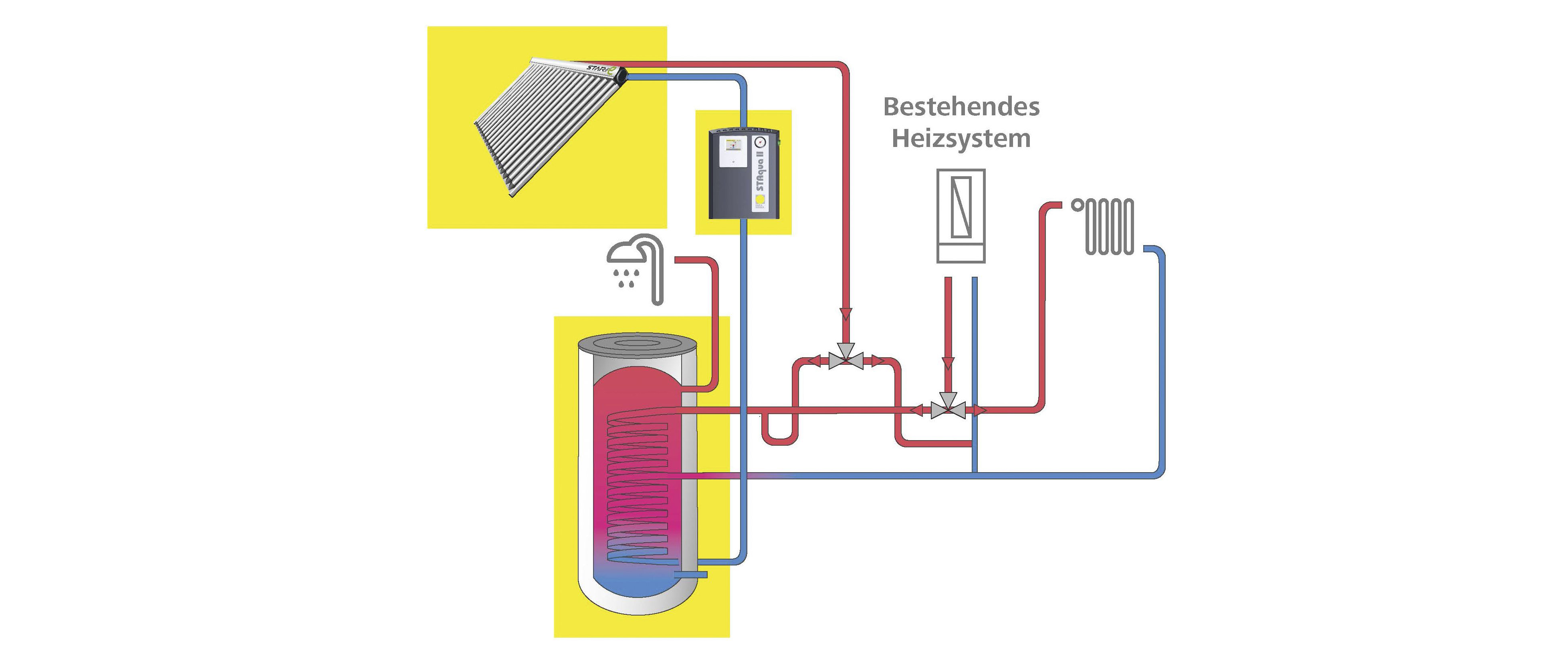 Auch hier wird die Solaranlage nach dem AquaSolar-Prinzip direkt in ein bestehendes Heizsystem eingebunden. Der bestehende Speicher – hier ein Stand-Warmwasserspeicher – arbeitet fortan als Solarspeicher. Ist dieser vollgeladen, wird die Solarwärme mittels eines Tuningsets/Umschaltventils aus dem Solarvorlauf direkt in den Heizungskreislauf eingespeist. Auf diese Weise kann die Sonnenenergie zur Heizungsunterstützung genutzt werden.