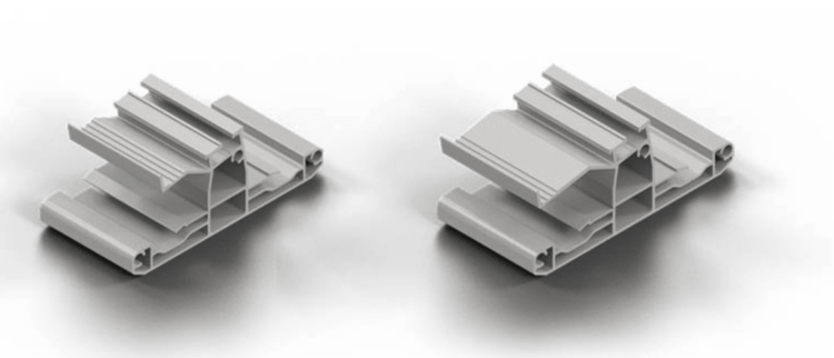 Die bisherige Bodenschiene war ein breites Strangpressprofil aus Aluminium. Sie besteht aus zwei nebeneinanderliegenden Hohlkammern. Die Lücke zwischen diesen beiden Kammern ist gleichzeitig die Nut, in die die Stützen eingeschraubt werden. Die Bodenschienen sind seitlich mit jeweils einer Auskragung verlängert. Sie sorgt dafür, dass die Auflagefläche möglichst groß ist und so die Last des Solarsystems auf dem Dach gut verteilt wird.