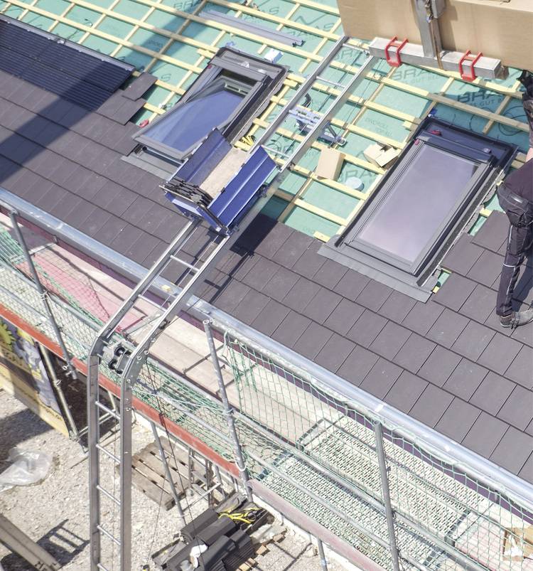 Bei der Montage achteten die Dachhandwerker darauf, dass die traufseitige Profilschiene und die Schiene am Modul ineinandergreifen und sicher halten. Anschließend konnte seitlich der Dachstein als halber beziehungsweise im Verbandswechsel als ganzer Stein beigedeckt werden.
