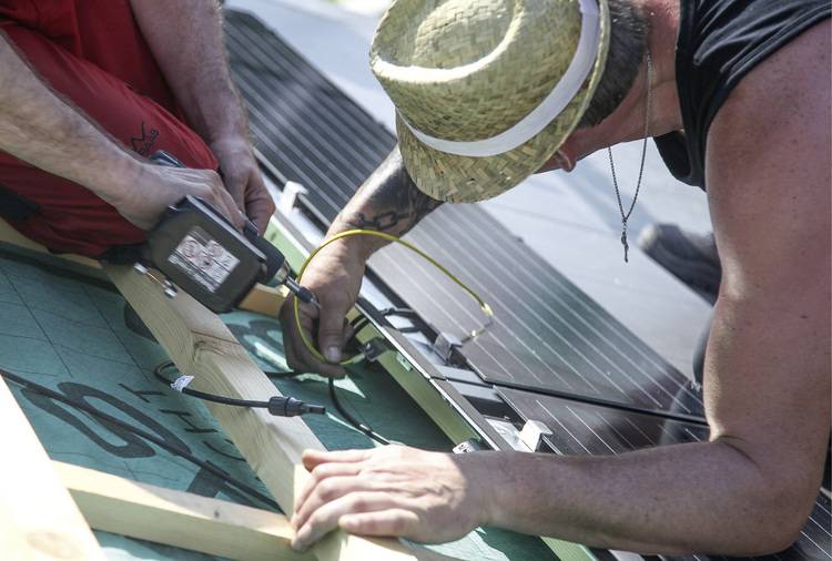 Dann wurden die Module mit den beiliegenden Spenglerschrauben auf der Traglatte fixiert. Günstig ist das System, da der Verlegeplan der Module problemlos an die Dachgeometrie angepasst werden kann. So wurden die Bereiche der Dachwohnfenster ausgespart.