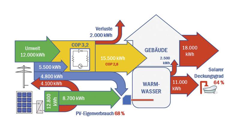 Subtrahiert man davon die solare Überschussenergie, die ins Netz eingespeist wird, zeigt die Gesamtenergiebilanz eine Reduktion des elektrischen Energieeintrages in das Gebäude von über 50 Prozent. Unter diesen Bedingungen beträgt der solare Deckungsgrad zur Warmwasserbereitung 64 Prozent. Der solare Eigenverbrauch erreicht 68 Prozent. Eine Steigerung wäre möglich, beispielsweise durch die Versorgung von Gemeinschaftsverbrauchern im Objekt.