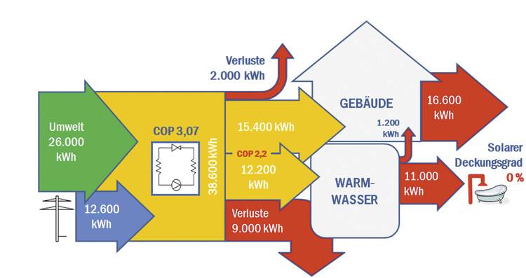 Bei dieser Annahme wird somit bereits von einem energetisch günstigeren Fall ausgegangen, da die Temperatur zur Warmwasserbereitung nicht ständig zur Verfügung stehen muss. Dennoch zeigt das Ergebnis einen hohen Verlust von 9.000 kWh, was 82 Prozent des erforderlichen Energiebedarfs zur Erwärmung des Brauchwassers entspricht.