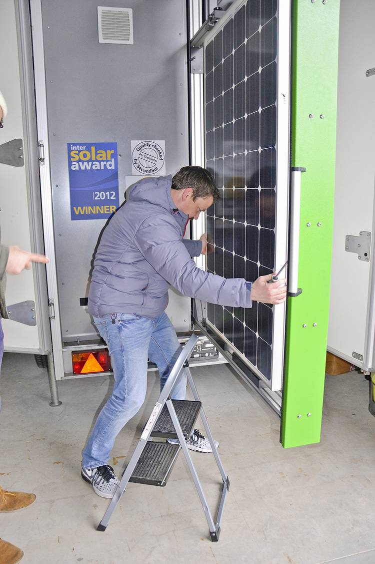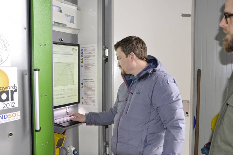 Entweder kauft der Kunde das Modul verbindlich bei einem Anbieter vom Marktplatz. Oder er kaufes direkt bei Secondsol, können es die Mitarbeiter in Meiningen im eigenen Flasher noch vermessen und Elektrolumineszenzaufnahmen machen, bevor es den Weg zum Kunden antritt. Dazu steht ein mobiler Testwagen von MBJ in einer der Lagerhallen. Sollten mehrere Module des gleichen Typs vorhanden sein, werden alle Paneele durchgemessen.