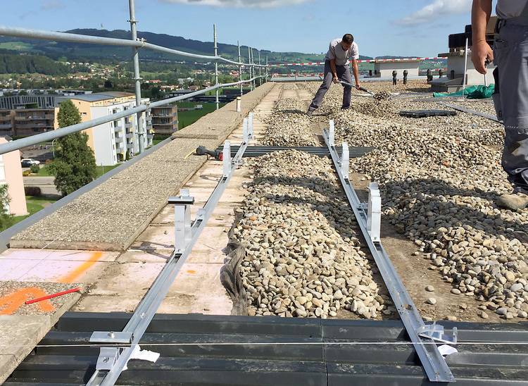 Die geforderte ebene Fläche wurde auf den Dächern in Bulle mit Solrec-Platten von Deltatec geschaffen. Das sind Trapezblechplatten aus Aluminium oder Chromstahl, die der Hersteller explizit für Solaranlagen auf flachen oder leicht geneigten Dächern entwickelt hat, auf denen bereits eine Kiesschüttung liegt.