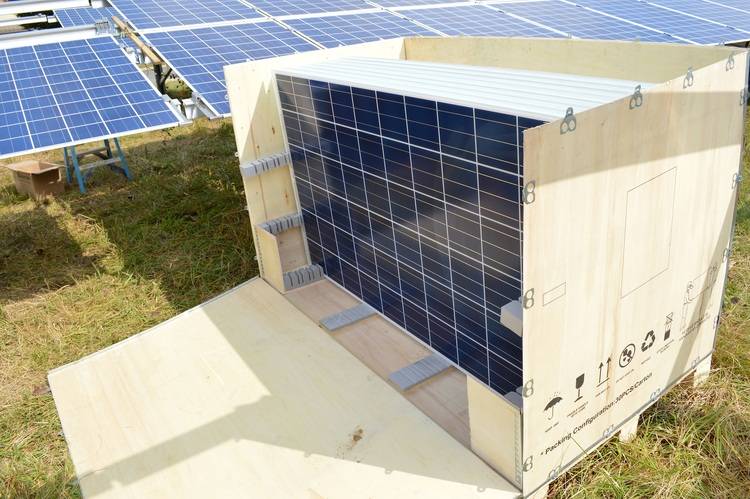 Trina Solar liefert die rahmenlosen Module in einer Holz- oder einer stabilen Kartonkiste. Die Module werden auf allen Seiten mit Schaumstoffblöcken stabilisiert, sodass sie während des Transports nicht aneinanderschlagen. In jeder dieser Kisten stehen 30 Module. „Der stehende Transport ist dabei vorteilhaft, weil dadurch Microcracks verhindert werden“, erklärt Stefan Ringbeck, für das Produktmarketing von Trina Solar in Europa verantwortlich.