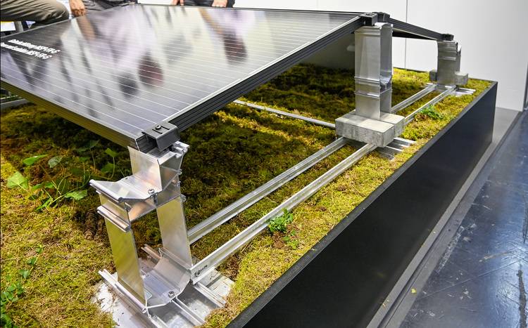 Das Thema solares Gründach deckt K2 Systems (A6.190) mit einem neuen System ab: dem Greenroof Vento. Dies ist eine optimierte Lösung, die genügend Abstand zu den Pflanzen hält, um Verschattungen zu vermeiden, die Pflege zu vereinfachen und ausreichend Licht für das Gründach zu lassen. So haben die Entwickler darauf geachtet, dass die Begrünung durch kleine Standfüße möglichst wenig gestört wird. So können auch niedrig wachsende Moose und Sukkulenten weiterhin Licht und Wasser erhalten.