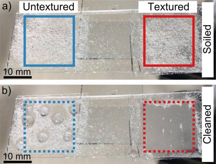„Einerseits müssen Druck und Wärme so groß sein, dass die Strukturen exakt übertragen werden, aber auch klein genug, dass die Folie aus Fluorethylen-Propylen transparent bleibt“, so Paetzold. Die geprägten Strukturen waren wasserabweisender als die unbehandelte Folie oder Glas. In Tests mit extrem stark verschmutzten Solarzellen konnte ein simulierter leichter Regenguss die Leistung bereits auf 93% wiederherstellen, wenn sie mit einer mikrostrukturierten Folie geschützt waren, und nur auf 60% bei herkömmlichen Abdeckgläsern von Solarmodulen.