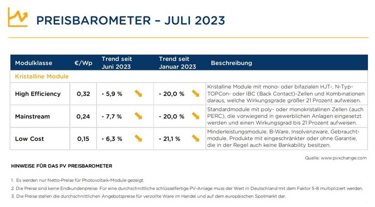 Auch in diesem Monat sind die Modulpreise wieder signifikant an breiter Front gefallen. Ein baldiges Ende der Talfahrt ist noch nicht in Sicht. Je nach Effizienzgrad und Güte gaben die Preise gegenüber dem Vormonat jeweils um etwa 6 bis fast 8 Prozent nach, womit alle Werte seit Jahresanfang um mindestens 20 Prozent gesunken sind. Schaut man sich die letzten 12 Monate an, erkennt man sogar einen Preiseinbruch von durchschnittlich 30 Prozent.
