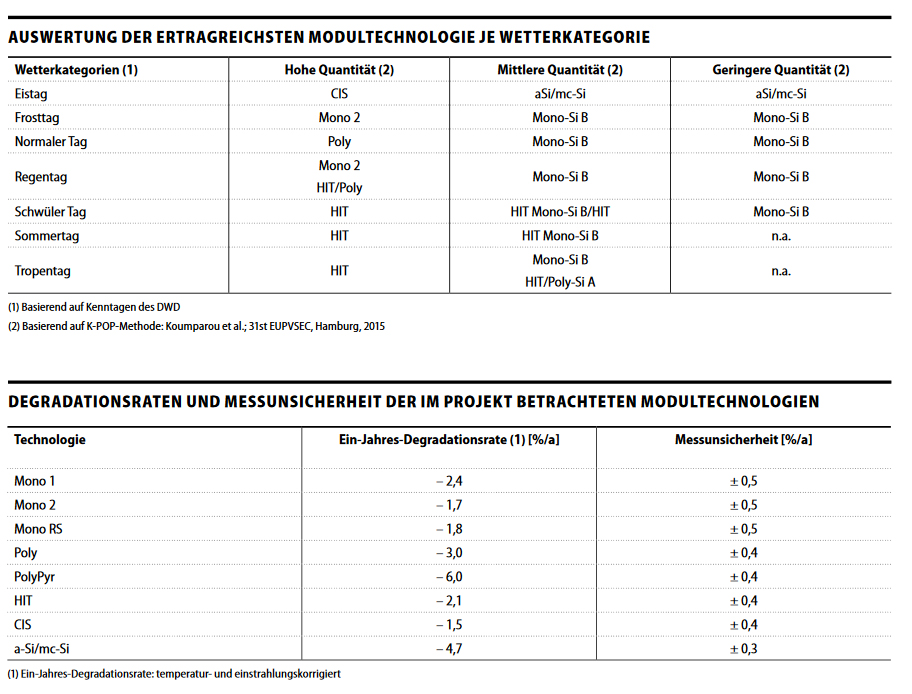 Dabei wurde das Wetter anhand mehrerer Kategorien auf Basis meteorologischer Kenntage des Deutschen Wetterdienstes (DWD) klassifiziert. Das ermöglicht einen regionalen Vergleich gemäß dem Einsatz in verschiedenen Klimazonen. Mithilfe von zahlreichen Messungen sollten Aussagen über die Modulperformance für unterschiedliche Standorte und Klimata ermittelt werden.