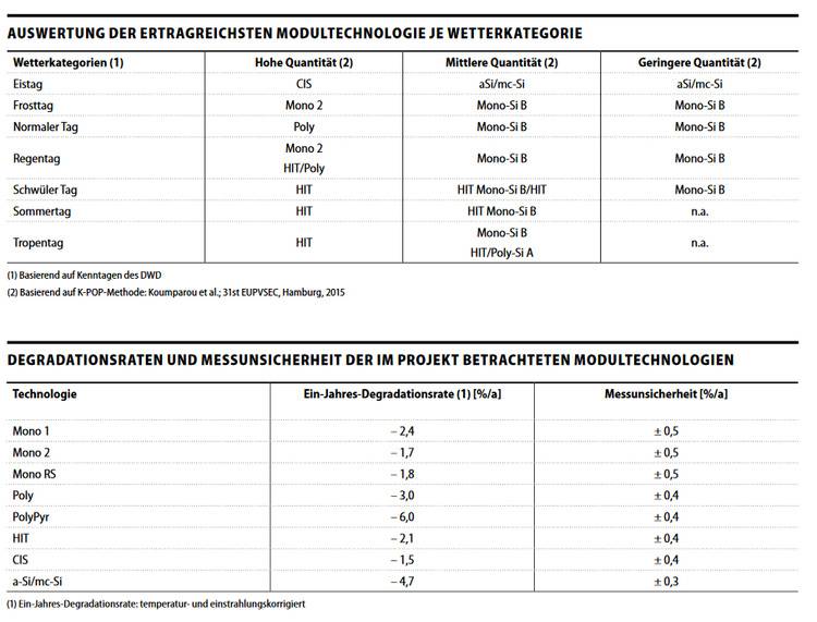 Aufgrund ihrer jeweiligen Technologie ergeben sich für die einzelnen Modultypen bei unterschiedlichen Bedingungen durchaus Unterschiede in den Jahreserträgen. Zusammenfassend lässt sich feststellen, dass sich die Monomodule bezüglich ihres Ertrags für fast alle Wetterkategorien als überlegen erwiesen. Nur bei hohen Temperaturen dominiert die Heterojunction-Technologie. Den größten Einfluss auf die Erträge haben Schwachlicht- und Temperaturverhalten.