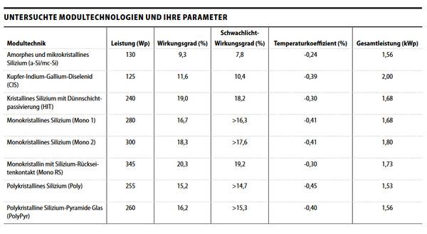 Auf dem Testfeld kamen verschiedene auf dem Markt erhältliche Solarmodule zum Einsatz. Dabei handelte es sich um:
