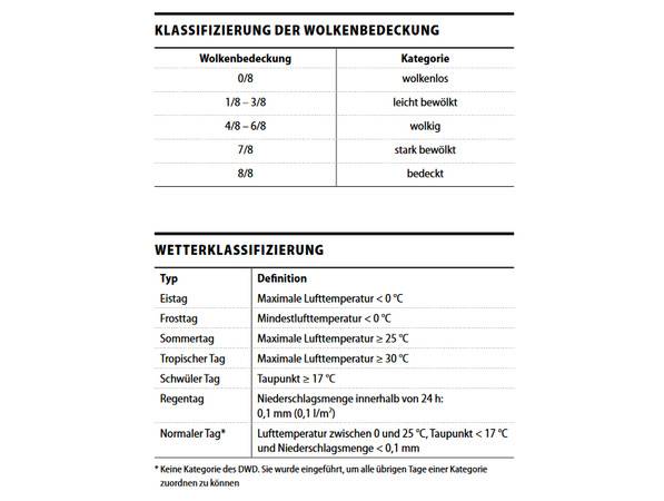 Diese klimatischen Klassifikationen erfolgten anhand der Definitionen des DWD. Einzelne Tage konnten mehreren Typen zugeordnet werden, sodass die Summe der Tage (490 Tage) die Anzahl der Tage des betrachteten Zeitraums (366 Tage) überschreitet.