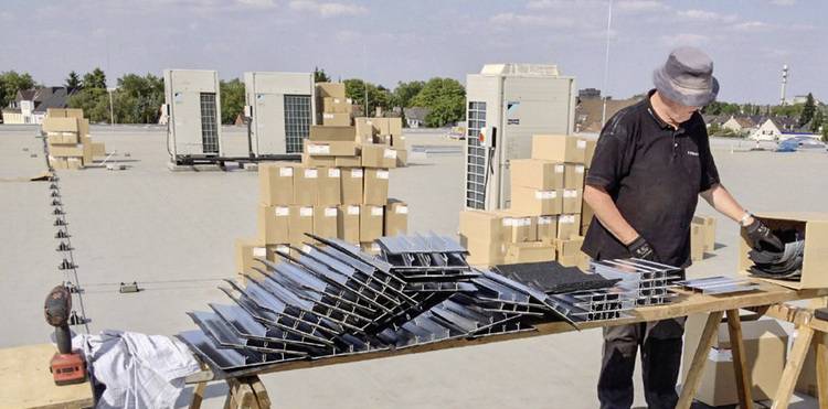 Installateure können die vormontierten Systemkomponenten innerhalb von fünf bis zehn Minuten pro Kilowatt installieren. Weil das schnell, ohne viel Material und mit wenig Ballast funktioniert, lassen sich pro Kilowatt fünf bis zehn Euro einsparen. Wird zusätzlicher Ballast benötigt, werden zunächst Pflastersteine in die Stützen gelegt und anschließend die Streben zur Ablage der Steine verdoppelt. Bei Bedarf müssen die Basisplatten dann vergrößert und an die entsprechenden Gegebenheiten angepasst werden.