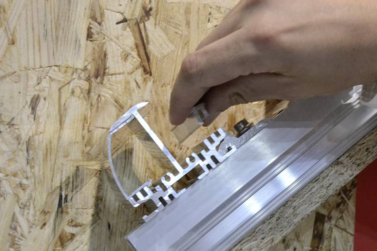 IBC Solar hat diese Herausforderung mit einer Adapterschiene gemeistert. Die Franken haben nur eine einzige Einlegeschiene entwickelt, die gleichzeitig als Rand- und als Mittelschiene dient. Wenn sie als unterer oder oberer Abschluss verwendet wird, klickt der Handwerker in die nicht benötigte Seite eine Abschlussblende aus Aluminium ein. Im Inneren des U-Profils sind mehrere Vertiefungen eingepresst – für jede gängige Rahmenhöhe eine.