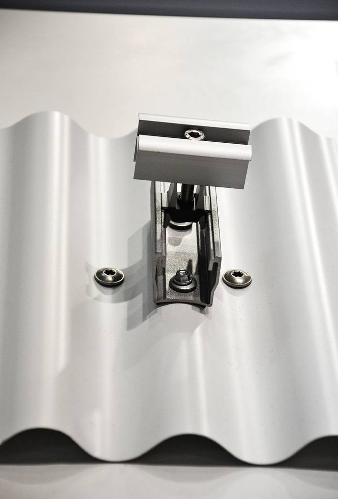 Ebenfalls neu ist die Schrägdachanbindung Multirail CSM, die voraussichtlich ab Ende 2021 auf den Markt kommt. CSM steht hier für Corrugated Sheet Metal. Das sind Wellplatten aus Metall. Auch hier haben die Entwickler das bestehende System für Trapezblechdächer angepasst, damit es in den Baukasten von K2 Systems passt.