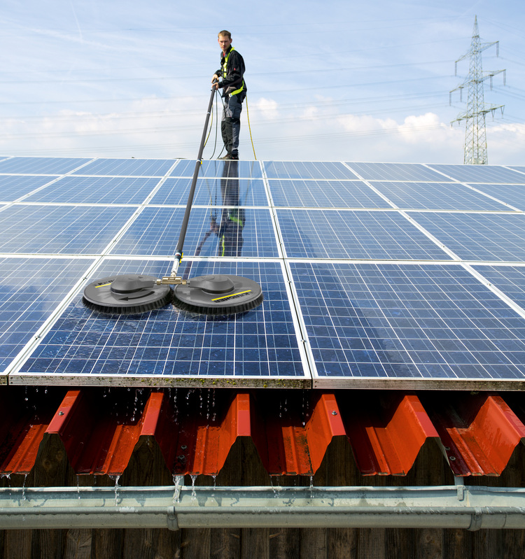 Anwender, die neben Solardächern beispielsweise auch Fassaden reinigen, brauchen ein variables System. Dafür sind Stangensysteme erhältlich, die sich für vertikale und horizontale Flächen eignen und verschiedene Aufsätze kombinieren. Es kann eine Hochdruckdüse für die punktuelle Reinigung verwendet werden, ein Aufsatz mit Scheibenbürsten für die Arbeiten an flach liegenden Solarmodulen oder eine rotierende Hochdruck-Walzenbürste, die sich auch für Fassaden eignet.