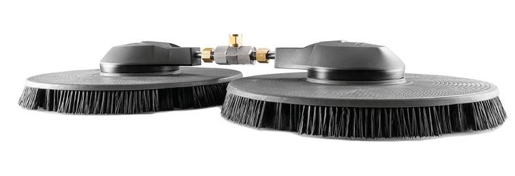 Das neutralisiert die Driftbewegung auf dem Dach. Die hohe Arbeitsbreite erlaubt eine hohe Flächenleistung, was die Kosten schont. Die Scheibenbürsten sind kugelgelagert und werden durch das Wasser aus dem Hochdruckreiniger angetrieben. Dabei genügt der Betrieb im Niederdruckbereich mit Kaltwasser und einer Fördermenge zwischen 700 bis 1.000 Litern pro Stunde.