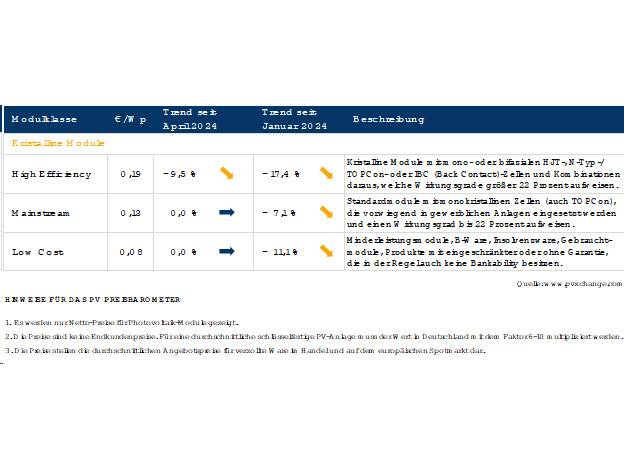 In diesem Monat hat sich bei den ohnehin schon preiswerten Modulen der unteren Leistungsklassen nicht mehr so viel getan, dass es bei den gerundeten Zahlen im Preisindex bemerkbar geworden wäre. Allerdings gab es bei den hocheffizienten Modulen ab 22 Prozent Wirkungsgrad eine deutliche Preisanpassung. Die Preise dieser, nun überwiegend mit N-Typ-/ TOPCon-Zellen ausgestatteten und in Doppelglas-Ausführung gelieferten Module gleichen sich zunehmend an die der Mainstream-Module an.