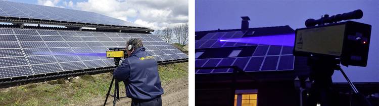 Das Prinzip ist sehr einfach zu verstehen: Solartektor nutzt einen blauen Laser, um die Solarzellen im Modul zu aktivieren. Damit lassen sich Solargeneratoren auch bei Bewölkung oder nachts ausmessen, sogar bei dünner Schneedecke oder Reif auf den Modulen. Während die Thermografie oder die Elektrolumineszenz auf bestimmte Einstrahlungsverhältnisse beschränkt sind, kann der Laser jederzeit ans Werk gehen.Weitere Geräte zur Fehlersuche runden das System ab.