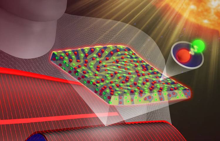 Zwei verschiedene Leuchtstoffe (rot und grün) sind auf der Nanoebene in einem Polymer eingefügt. Dieses ist flexibel, durchlässig und fungiert gleichzeitig als Solarkonzentrator zur Energiegewinnung, der auf Textilfasern aufgebracht werden kann.