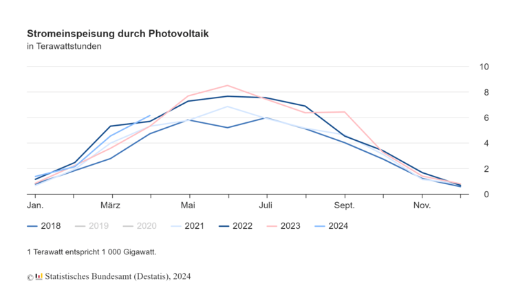 Durch den Betrieb von Photovoltaikanlagen wurden 2023 hierzulande rund 53,6 Millionen Megawattstunden Strom ins Netz eingespeist. Damit entfielen 11,9 % des eingespeisten Stroms in Deutschland auf Photovoltaik – ein neuer Höchstwert. 2022 hatte Photovoltaik einen Anteil von 10,6 % an der gesamten Stromeinspeisung ausgemacht. Rekordmonat für Solarstrom in Deutschland war bisher der Juni 2023: Mit gut 8,5 Millionen Megawattstunden wurde mehr als ein Viertel (27,3 %) des eingespeisten Stroms in jenem Monat mithilfe von Photovoltaikanlagen erzeugt.