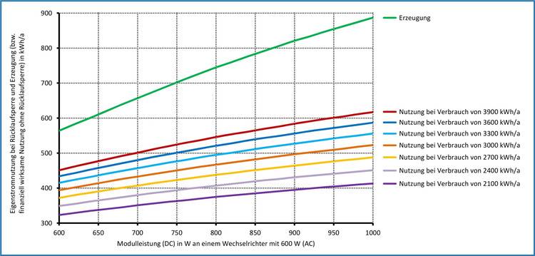 Nimmt man ein oben als Steckersolargeräte-Äquivalent definiertes Balkonkraftwerk an – die Peakleistung von zwei gleich ausgerichteten Modulen beträgt 650 W und der Mikro-(Modul)Wechselrichter hat eine AC-Leistung von 600 W –, ergibt sich bei einer mittleren Solareinstrahlung von 1.050 kWh/m2 und einem Abminderungsfaktor von 0,8 zur pauschalen Berücksichtigung der tatsächlichen Montagebedingungen eine Erzeugung von 480 kWh/a. Damit würde man schon für einen Stromverbrauch von 2.400 kWh/a das von der Bundesregierung „geforderte“ und bei der Strompreisbremse implizierte Einsparziel von 20 % erreichen.