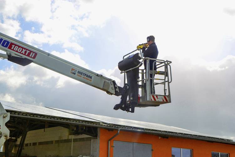 Um die Anlage gut einsehen zu können, nutzten die Handwerker aus Neustadt-Glewe eine Hebebühne. „Mit der können wir 15 bis 20 Meter in die Höhe fahren“, sagt Huber. „Da der Laserprojektor auch bei einem Abstand von mehr als 100 Metern noch genau misst, können wir so auch bei großen Anlagen auf Gewerbedächern 40 Prozent der Modulfläche erfassen, ohne die Hebebühne versetzen zu müssen.“ Ein Zielfernrohr auf dem Laserprojektor sorgt dafür, dass man auch in diesem Abstand das Modul auf dem Dach noch erkennen kann.