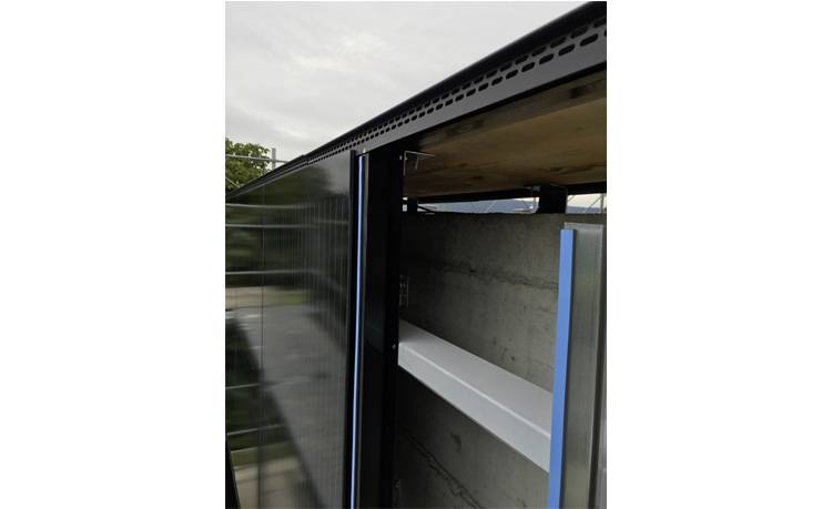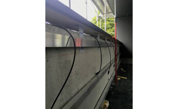 Dazwischen liegt der Bereich der Kaltfassade des unteren Stockwerks, der zur Hälfte aus Fenstern besteht. Zwischen den beiden Fensterfronten sind die anthrazitfarbenen Eternitplatten montiert. Unter den Fenstern und den Fassadenplatten sind die Solarmodule angeklebt. In diesem Bereich wurde die gesamte Verkabelung in den Nischen der Rollläden und Lamellenvorhänge verlegt.