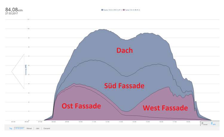 Dabei haben die Fassadenanlagen noch einen weiteren Vorteil. Gerade im Winter, wenn der Wärmebedarf besonders groß ist, steht die Sonne in einem besseren Winkel zu den Modulen an der Fassade, sodass dann üppig Strom produziert wird. Aber auch über den Tagesverlauf im Sommer ist die Stromproduktion relativ flach, sodass über den Tag hinweg genügend Strom erzeugt wird, ohne dass es zu den Mittagsspitzen kommt, die für nach Süden ausgerichtete Anlagen typisch sind. Dadurch steigt die Möglichkeit für den Eigenverbrauch des Stroms.
