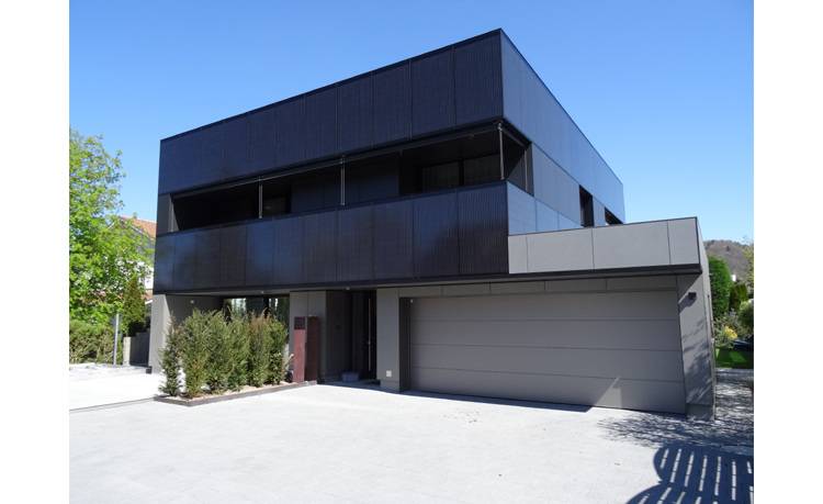 Das kommt nicht von ungefähr. Es sind die Busbars der Solarmodule, die senkrecht an der Fassade installiert sind. Auf der Südseite über der Garage sind vier Module waagerecht angebracht, was aber den optischen Gesamteindruck nicht stört. Mehr ist von der Technologie nicht zu sehen. Denn die monokristallinen Solarzellen verschwinden optisch in der schwarzen Folie, die zwischen ihnen und dem Rückglas liegt. „Wir haben lange nach den richtigen Modulen gesucht, die sowohl zur Optik des Gebäudes als auch zu unseren Preisvorstellungen passten”, erklärt Matthias Oldani, Architekt des Gebäudes. „Wir wurden dann in Österreich bei PVP fündig.”