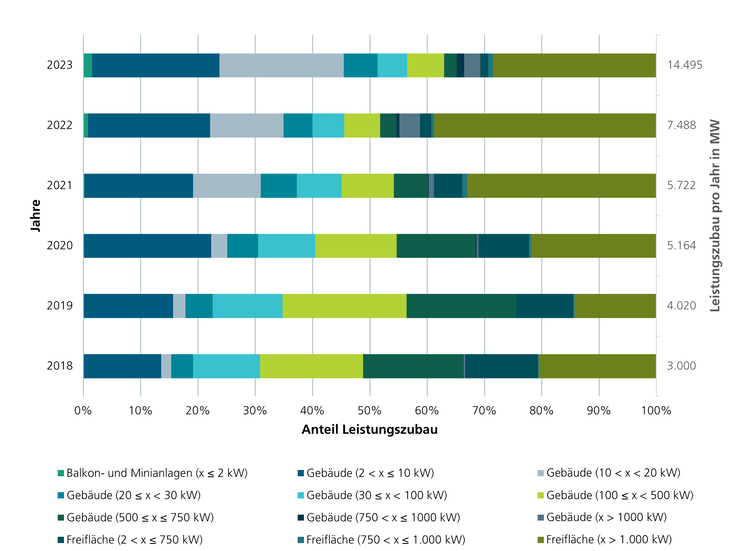 In Deutschland waren bis Ende des Jahres 2023 insgesamt knapp 3,7 Millionen PV-Anlagen mit einer installierten Leistung von über 82 Gigawatt in Betrieb. Allein im Jahr 2023 wurden erstmals über eine Million neue Anlagen installiert. Dabei ist mit über 293.000 neu gemeldeten Anlagen ein starker Zubau von Balkon- und Minianlagen bis 2 kWp zu beobachten. Hier steigerten sich die relativen Anteile am Zubau von 2 Prozent im Jahr 2019 auf 29 Prozent im Jahr 2023. Gebäudeanlagen zwischen 2 und 10 kWp machen mit durchschnittlich 64 Prozent von 2001 bis 2023 weiterhin den größten Anteil am Anlagenzubau aus.
