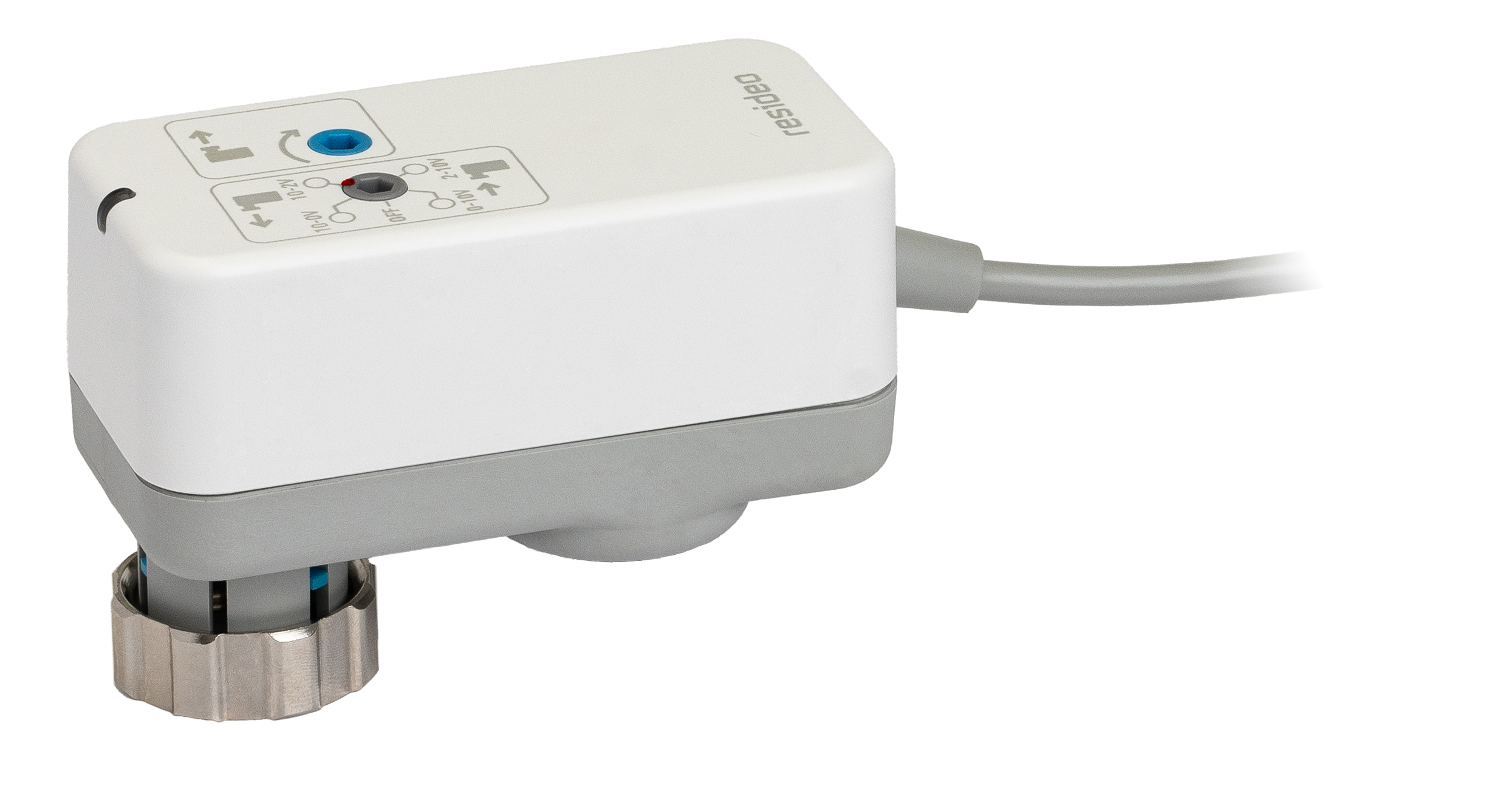 Elektronischer Stellantrieb für Heizungsventile, weiß-grau, mit Anschlusskabel, abgebildet vor weißem Hintergrund, geeignet für SHK-Anwendungen.