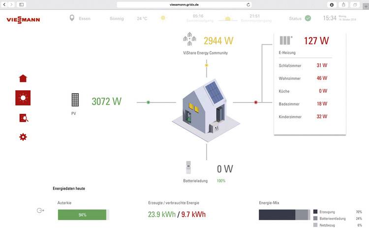 Alles im Blick: Spezielle Software visualisiert die Stromerzeugung der PV-Anlage, den Ladezustand einer Batterie und den Stromverbrauch im Haushalt, inklusive Heizung.