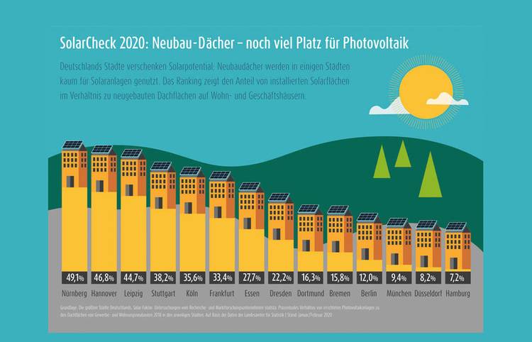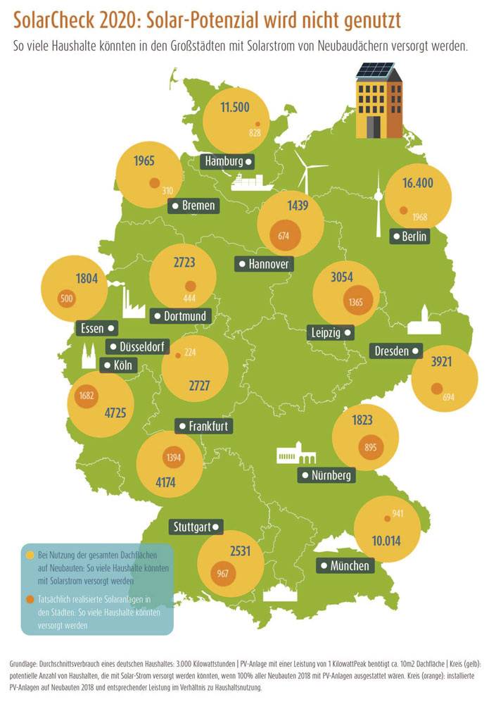 Umgerechnet auf die deutschen Haushalte (Durchschnittsverbrauch 3.000 kWh/Jahr) zeigen sich die Möglichkeiten der einzelnen Städte: Hätte München das Potenzial der Neubaudachflächen voll und ganz genutzt, hätten sie allein mit den 2018 neu errichteten Solarflächen über 10.000 Haushalte mit Solarstrom versorgen können, Hamburg rund 11.500 Haushalte, in Berlin wären es 16.200 Haushalte. Gerade in den Millionenstädten wird davon nur ein kleiner Bruchteil erschlossen, wie der SolarCheck zeigt.
