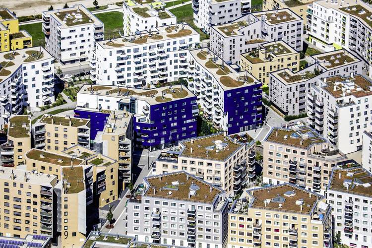 Das ganz neue Quartier auf dem Gelände eines ehemaligen Flugfeldes am Rande von Wien glänzt neben einer modernen Architektur vor allem mit seinen weitreichenden Ansätzen der energetischen Vernetzung. So wurden auf einigen Gebäuden Solaranlagen errichtet. Andere waren aufgrund der sehr dichten Bebauung nicht geeignet. Sie nutzen den Strom, den die benachbarten Gebäude übrig haben.
