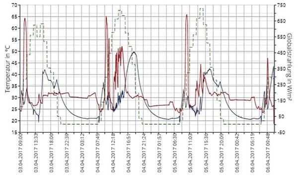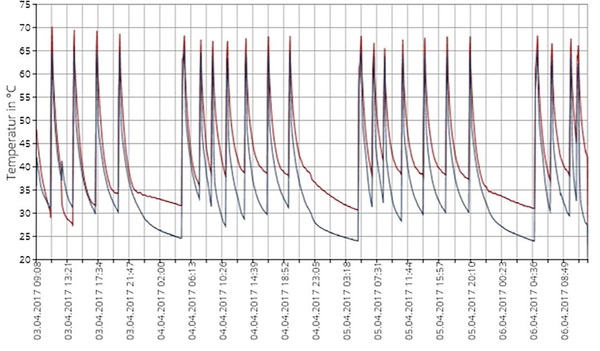 In Bild 2 sind die Temperaturverläufe einer Solaranlage abgebildet, in Bild 3 deren Nachheizung durch den Kessel. Zu sehen ist in diesem Fall eine sehr schlecht laufende thermische Solaranlage, die nicht in der Lage ist, hohe Temperaturen an den Speicher zu übergeben. Fossiler Brennstoff wird so nicht eingespart und der Anlagenzweck völlig verfehlt.