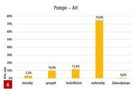 Bisher sind nur bei jeder elften Anlage Hocheffizienzpumpen im Betrieb. Für Anlagen, die ab 2015 installiert wurden, sind sie Pflicht. Obwohl mehrstufige Umwälzpumpen in der Auswertung seit 2008 an Bedeutung verlieren, stellen sie mit über 74 % den größten Anteil (Bild 6).