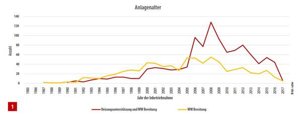 In den Jahren 2016 und 2017 wurden jeweils von April bis September thermische Solaranlagen in privaten Wohngebäuden untersucht. Insgesamt 1849 Anlagen aus den letzten drei Jahrzehnten durchliefen den Check (Bild 1). Es handelt sich dabei fast ausschließlich um kleinere Anlagen mit einer Kollektorfläche meist deutlich unter 50 m². 764 der untersuchten Solaranlagen sind Systeme zur Trinkwassererwärmung, 1085 dienen zusätzlich der Heizungsunterstützung.