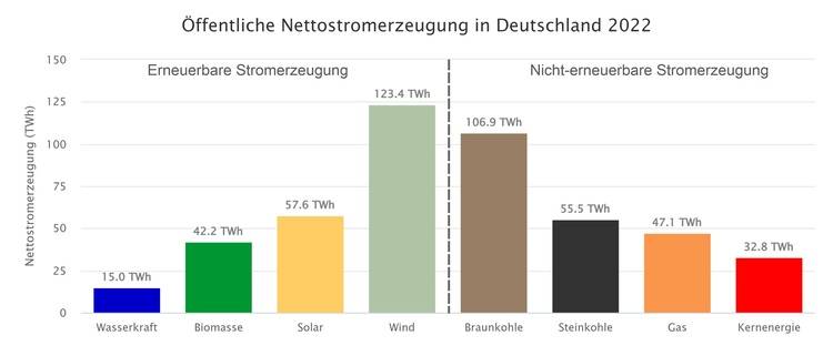 In Summe produzierten die erneuerbaren Energiequellen im Jahr 2022 ca. 244 TWh und damit etwa 7,4 Prozent mehr als im Vorjahr (227 TWh). Ihr Anteil an der öffentlichen Nettostromerzeugung stieg auf 49,6 Prozent (2021: 45,6 Prozent) und ihr Anteil an der Last lag bei 50,3 Prozent.