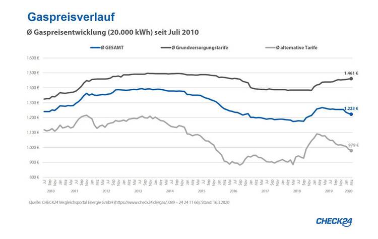 Beim Gaspreis geht die Preisschere zwischen Alternativtarifen und Grundversorgung weiter auseinander. Während Grundversorgungstarife zuletzt teurer wurden, sanken die Preise bei Alternativtarifen. Im Schnitt kosten 20.000 kWh im März 2020 in der Grundversorgung 1.461 Euro, bei Alternativanbietern 979 Euro – ein Unterschied von 482 Euro.