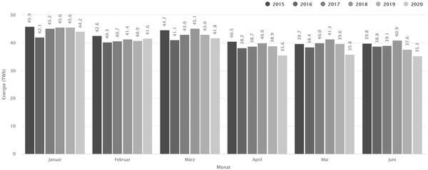 Ab dem zweiten Quartal 2020 machte sich die gesunkene Stromnachfrage aufgrund der durch die Corona-Pandemie rückläufigen Industrieproduktion bemerkbar. Die Last ging zurück auf 35,3 TWh im Juni (Juni 2019: 37,6 TWh), die Stromproduktion sank von 47,9 TWh im Januar auf 36,0 TWh im Juni.