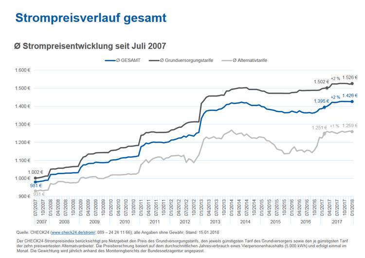 Vierpersonenhaushalte mit einem Stromerbrauch von 5.000 kWh zahlen aktuell im Durchschnitt 1.426 Euro. Damit ist der Strompreis in den vergangenen zwölf Monaten um rund zwei Prozent gestiegen. Anfang 2017 kostete die gleiche Menge Strom 1.395 Euro. "Der Strompreis wird 2018 auf seinem Rekordhoch bleiben", sagt Dr. Oliver Bohr, Geschäftsführer Energie beim Vergleichsportal Check24. Trotz geringerer Kosten bei EEG-Umlage und Netzentgelten sei mit einer Welle von Strompreissenkungen für dieses Jahr nicht mehr zu rechnen.