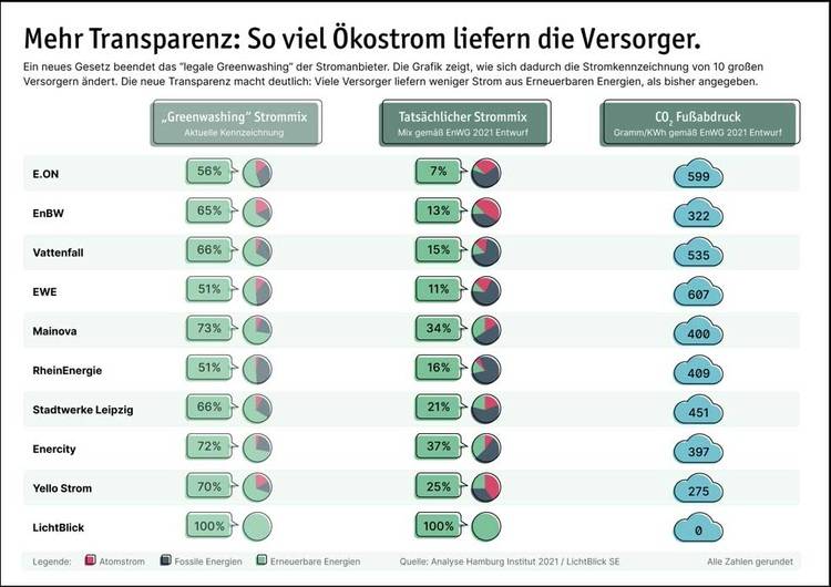 „Die Verantwortung für die jahrelange Verbrauchertäuschung liegt nicht bei den Versorgern, sondern beim Gesetzgeber. Es handelt sich bei der aktuellen Stromkennzeichnung um legales Greenwashing. Das ändert der Gesetzgeber jetzt“, erläutert Ralph Kampwirth, Unternehmenssprecher von LichtBlick. „Mit der Neuregelung wird künftig klar ersichtlich, ob Stromversorger ihren Strom aus Kohle, Atom oder erneuerbaren Quellen beziehen. Das schafft mehr Transparenz für Stromkund*innen.“