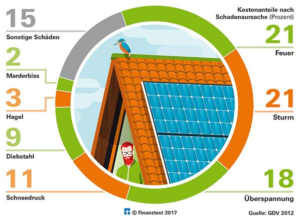Kunden können Photovoltaik-Versicherungen als Zusatzbaustein ihrer Wohngebäudeversicherung abschließen oder als separate Police bei einem anderen Anbieter. Die untersuchten Zusatzbausteine zur Gebäudeversicherung kosten zwischen 28 und 132 Euro pro Jahr. Es gibt zwar auch Wohngebäudetarife, die kleine Anlagen bis zehn Kilowatt mitversichern. Der Schutz bezieht sich dann aber oft nur auf Risiken, für die die Gebäudepolice greift, zum Beispiel Feuer, Sturm oder Hagel. Nicht dazu gehören u. a. Marderschäden, Diebstahl oder Kurzschluss. Finanztest hat insgesamt sieben Versicherungen gefunden, bei denen sowohl die zugrundeliegende Wohngebäudeversicherung empfehlenswert ist als auch der von Finanztest definierte Mindestschutz für die Solaranlage gilt.