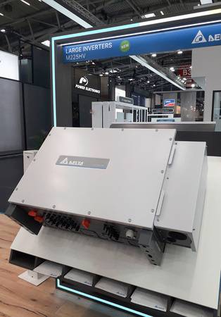 Für die Mittelspannung stellte Delta das PCS3450 MV Skid vor, ein Power Conditioning System (PCS) mit MV-Transformator. Es eignet sich insbesondere für industrielle Stromspeicher, denn es kombiniert Zentralwechselrichter und String-Architekturen. Es leistet bis zu 3,45 Megawatt und ist mit vielen Batterien kompatibel. Integriert ist zudem ein Mittelspannungstrafo mit 34,5 Kilovolt.