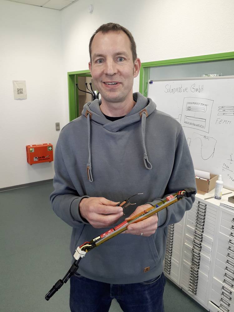 CTO von Solarnative ist Henk Oldenkamp. Als er vor vier oder fünf Jahren beim PV-Symposium in Bad Staffelstein den Powerstick für den Modulrahmen ankündigte, ging die Idee ein wenig unter. Nun sind die kompakten Mikrowechselrichter erhältlich. Eine Fabrik wurde gebaut und die Massenfertigung gestartet.